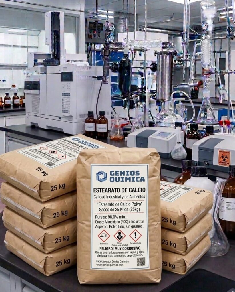 Sal cálcica del ácido esteárico, en forma de polvo blanco, empleada como lubricante, estabilizante en plásticos y agente antiaglomerante en diversas formulaciones.